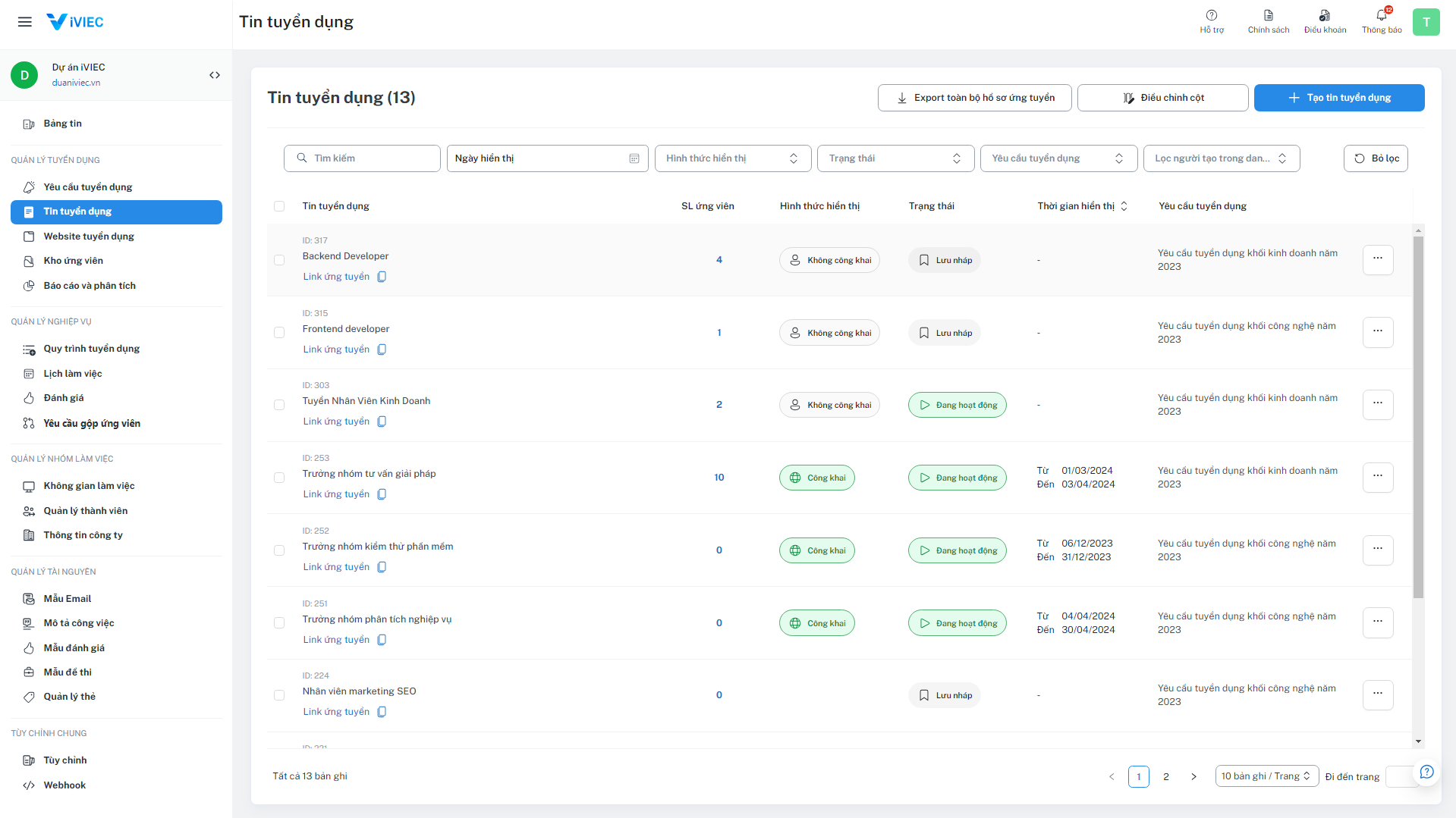 **Bước 1**: Trong workspace của bạn, tìm đến bất kỳ màn danh sách chứa thông tin ứng tuyển. Dưới đây là ví dụ về màn danh sách thông tin ứng tuyển trong tin tuyển dụng.&#x20;