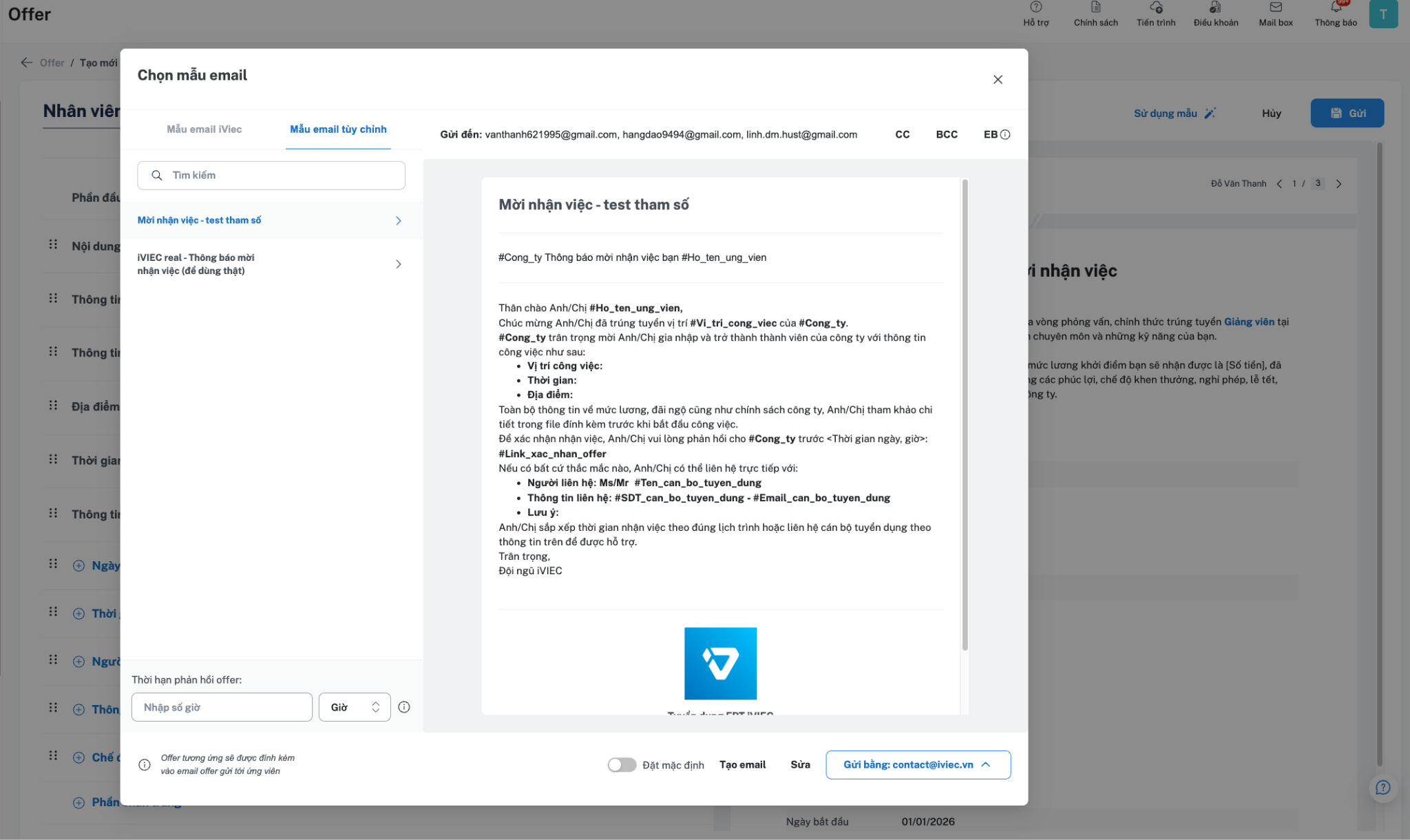 Trước khi gửi, hệ thống sẽ hiện thị mẫu email mặc định khi gửi offer đến ứng viên, bạn có thể chỉnh sửa, hoặc sử dụng mẫu tuỳ chọn.